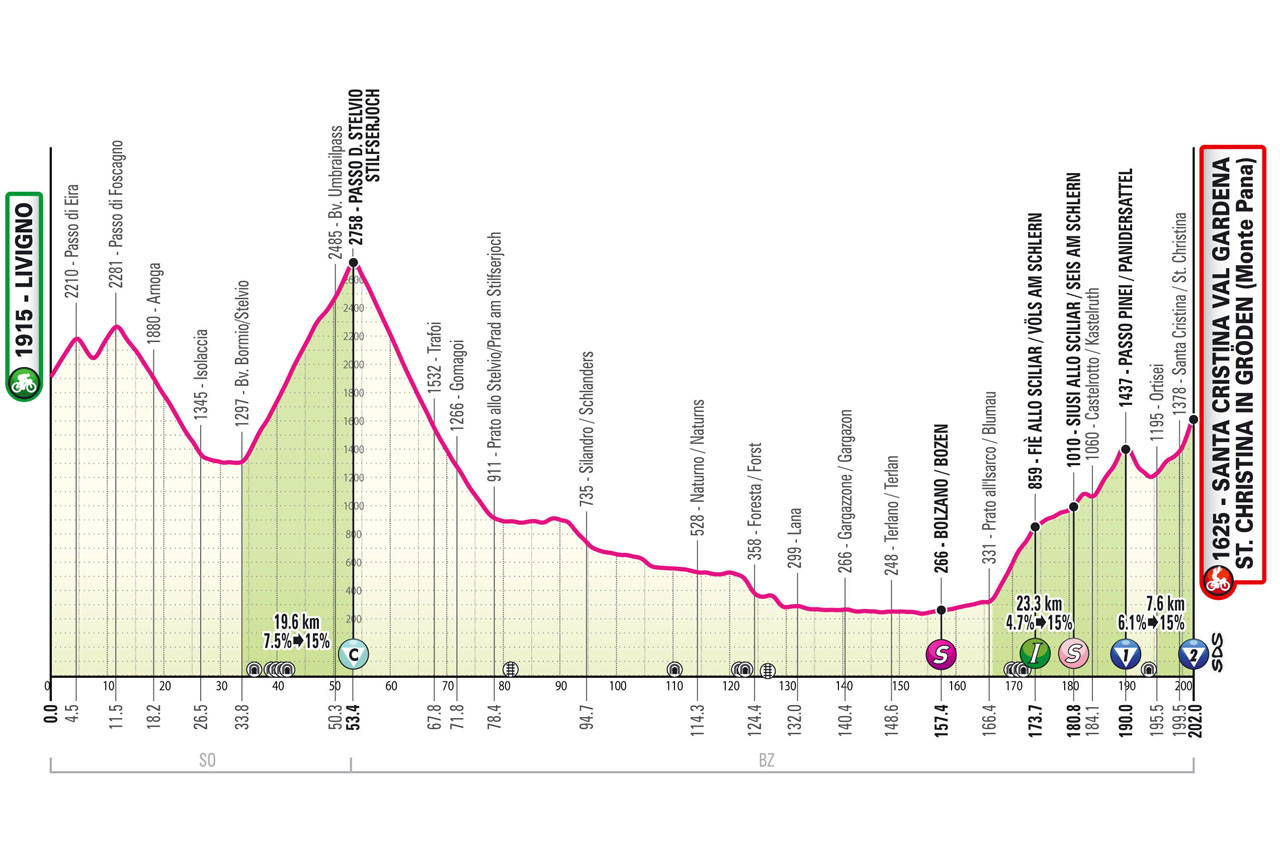 Ya en la última semana, etapa de más de 200 km entre Livigno y el Monte Pana, en Santa Cristina Val Gardena, teniendo un recorrido de alta montaña aunque bastante peculiar, con un inicio duro, largo llano central y final de nuevo exigente. De salida, el encadenado de Passo Eira + Foscagno, al revés que en la etapa previa, descenso hacia Bormio y el mítico Passo dello Stelvio -> historia, siendo la Cima Coppi de este Giro (si la nieve lo permite, como veremos más tarde), con 2758 m de altitud, teniendo por esta vertiente 19,6 km al 7,5%, con preciosos paisajes. Tras su espectacular bajada -> fotos, plagada de «tornanti», hay casi 80 km de valle, con paso incluído por Bolzano, hasta comenzar el Passo Pinei -> más perfiles, irregular pero muy largo y con inicio y final duros, seguido por el Monte Pana desde Ortisei con 2 km finales al 12% que pueden hacer mucho daño, sobre todo si la carrera llega ya rota. Señalar que si bien el Monte Pana es un final inédito, ya ha habido llegadas en Ortisei, aunque subiendo por la ctra. principal, en 2005 y 2017.