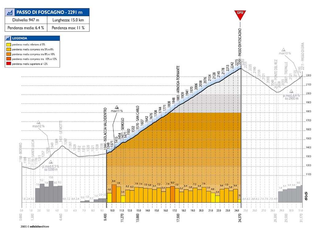 Sobre antecedentes, con Foscagno + Eira y final en Livigno hubo etapa en 2005, si bien tanto el recorrido previo, con el Stelvio por Prato, como la llegada, en la propia localidad, era distinto, triunfando la escapada. Por otro lado, señalar que los últimos 85 km son diferentes a los de la presentación -> etapa original, al haber sustituído Aprica y el colosal Forcola di Livigno, que formaban un gran enlazado, por Mortirolo y Foscagno, además de hacer Eira por la vertiente contraria, debido a la negativa de las autoridades suizas -> comunicado oficial. Una pena, ya que si bien el kilometraje y desnivel es muy similar, Forcola di Livigno es más rompedor que Foscagno. Y había más alternativas, como llegar a Bormio a través del Passo Gavia. Y si este no fuera transitable, subir el Mortirolo por la variante de la recta Contador, más dura que la vía principal -> comparativa vertientes. De todos modos, sigue habiendo terreno para ver un gran espectáculo si los corredores se muestran combativos, sin esperar al muro final.