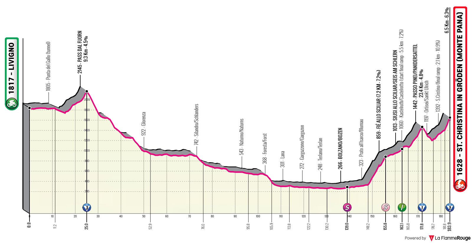 Ya en la última semana, etapa de más de 200 km entre Livigno y el Monte Pana, en Santa Cristina Val Gardena, teniendo un recorrido de alta montaña aunque bastante peculiar, con un inicio duro, largo llano central y final de nuevo exigente. De salida, el encadenado de Passo Eira + Foscagno, al revés que en la etapa previa, descenso hacia Bormio y el mítico Passo dello Stelvio -> historia, siendo la Cima Coppi de este Giro (si la nieve lo permite, como veremos más tarde), con 2758 m de altitud, teniendo por esta vertiente 19,6 km al 7,5%, con preciosos paisajes. Tras su espectacular bajada -> fotos, plagada de «tornanti», hay casi 80 km de valle, con paso incluído por Bolzano, hasta comenzar el Passo Pinei -> más perfiles, irregular pero muy largo y con inicio y final duros, seguido por el Monte Pana desde Ortisei con 2 km finales al 12% que pueden hacer mucho daño, sobre todo si la carrera llega ya rota. Señalar que si bien el Monte Pana es un final inédito, ya ha habido llegadas en Ortisei, aunque subiendo por la ctra. principal, en 2005 y 2017.