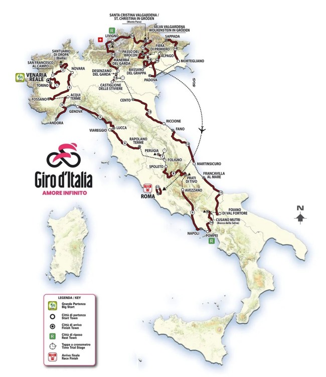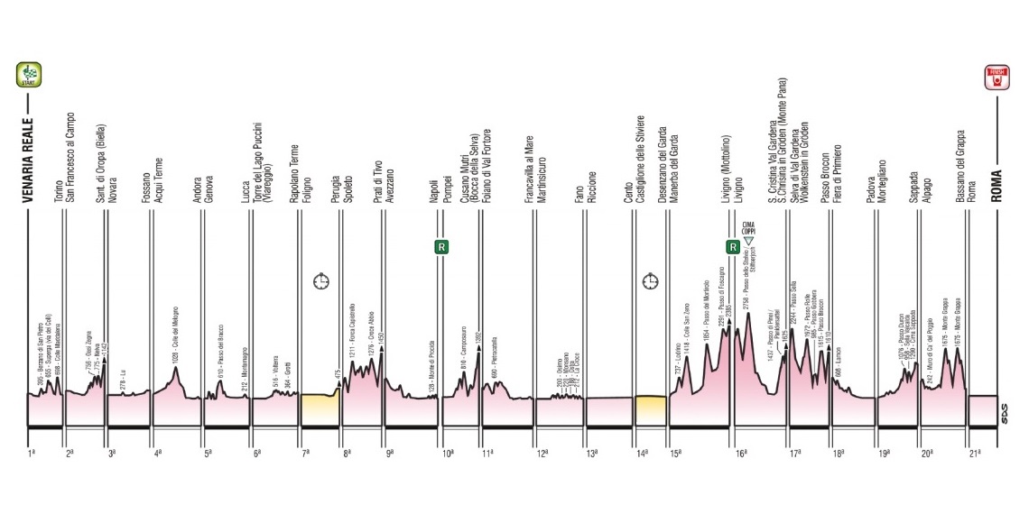 Como decíamos en la entrada previa, se trata de la 107ª edición de la prueba, con salida desde Venaria Reale, en Turín, el sábado 4 de mayo y final en Roma, la capital de Italia, el día 26 del mismo mes, para un total de 3401 km (sin contar los tramos neutralizados) divididos en 21 etapas, con una media de 162 km por etapa, además de las 2 jornadas de descanso intercaladas. Y con cambios significativos en varias etapas respecto al recorrido presentado en octubre, además de aumentar el kilometraje total.
