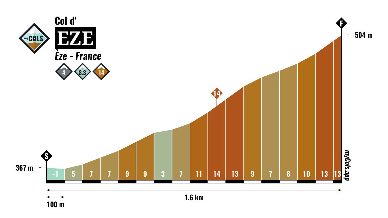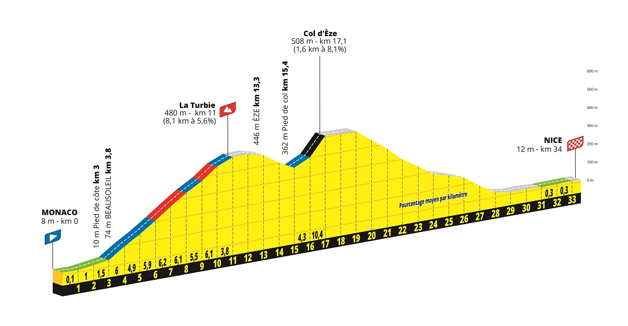 Y cerrando la prueba, en lugar del clásico final en París, la carrera termina con una contrarreloj de casi 34 km entre Mónaco y Niza, teniendo un recorrido muy exigente al incluir el ascenso a La Turbie, con 8 km al 5,6%, y el muro del Col d’Eze, habitual en la París-Niza y con 1,5 km al 9%, antes del descenso y llano final -> plano de la CRI, como si fuera una «mini-etapa», en una jornada clave para el podio final si la general llegue apretada. De hecho, la última vez que una crono tan montañosa fue la última jornada decisiva, la CRI de P.D.Belles Filles 2020 -> vídeo, hubo vuelco en la general, con Pogacar desbancando a Roglic, además de colocarse 3º Porte. Y aunque sus características eran distintas, siendo llana, también hubo cambio de líder la última vez que una crono cerró la prueba, en la mítica CRI de París 1989, con Lemond ganando a Fignon.
