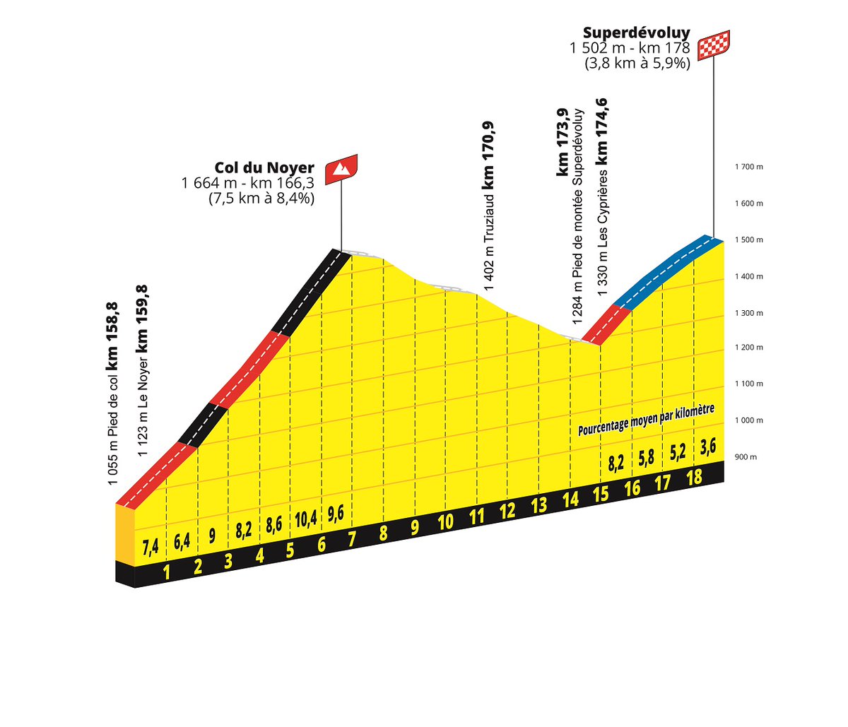 Ya en la 3ª semana, después del descanso, etapa llana con 190 km entre Gruissan y Nîmes, siendo el último día para los sprinters, aunque atención de nuevo al viento y la posibilidad de abanicos, con los últimos antecedentes en 2014, ganando Kristoff, y 2019 -> vídeo, con triunfo para Ewan. Las 2 jornadas siguientes, ya en los Alpes, son de media montaña, con casi 180 km entre S.Paul Trois Châteaux y la estación de Superdevoluy, sin grandes dificultades durante los primeros 130 km pero que tras el paso por Gap enlaza el Col de Bayard, con unos 7 km al 7%, incluyendo tramo al 10%; Col du Noyer, que sin contar un primer repecho tiene 7,5 km al 8,2%, los dos últimos al 10%; y tras el descenso (hasta km 7,5) la subida hasta meta, con casi 4 km al 6% -> encadenado final, pudiendo dar mucho juego si hay buen ritmo. Señalar que si bien Superdevoluy se estrena en el Tour, esta misma llegada se vio en Dauphiné 2016 -> vídeo, triunfando la escapada de Cummings y con ataque de Contador en Noyer para la general, aunque fue atrapado por los demás favoritos, ganando la carrera Froome.