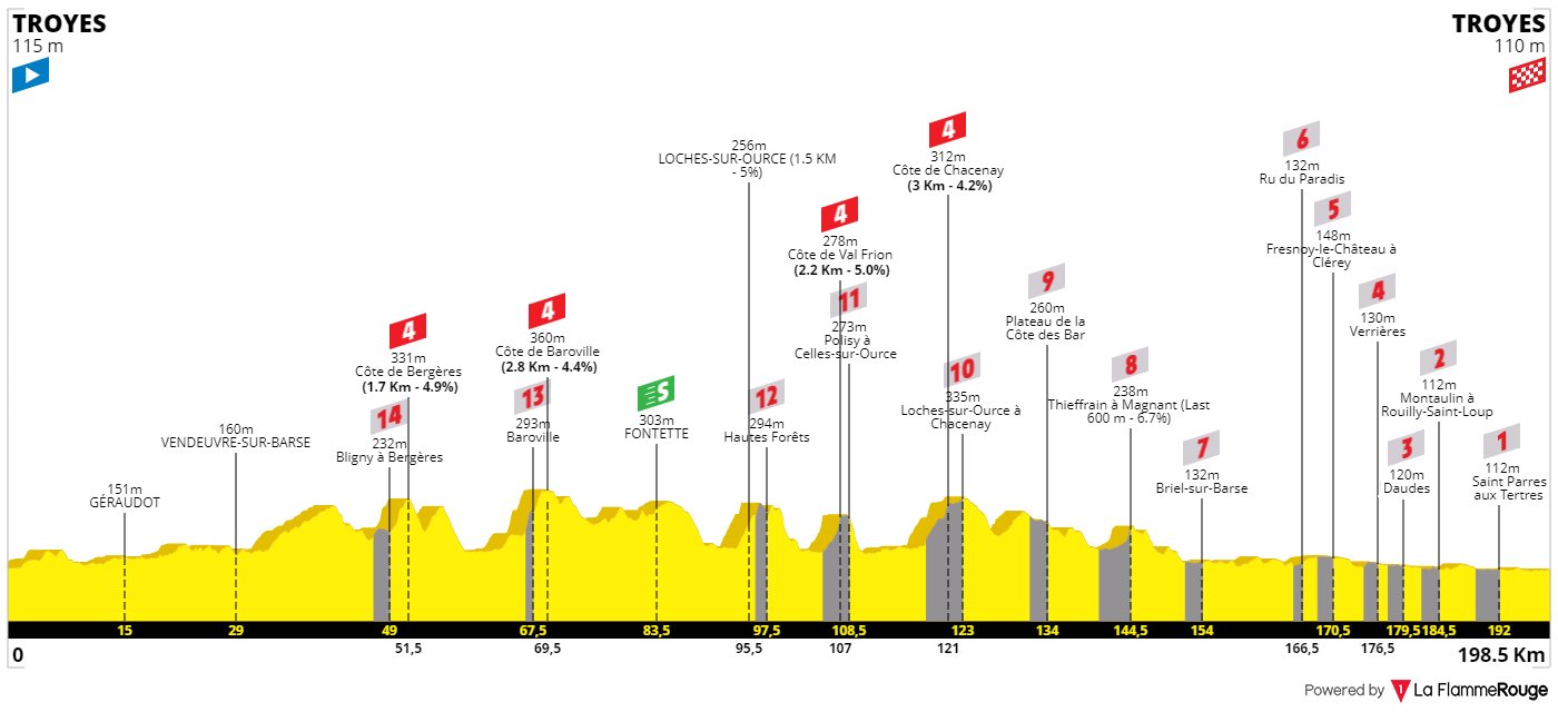 Y cerrando la 1ª semana, una de las etapas más llamativas de esta edición, con 200 km en torno a Troyes, incluyendo nada menos que 14 tramos de tierra, «chemin blanc», que suman 32 km sin asfaltar, estando en principio en buenas condiciones, aunque con mayor riesgo de pinchazos que en una carretera normal, siendo caminos en general más similares a los de la París-Tours que a los de Strade Bianche. No obstante, se pueden dividir en dos tipos: los primeros 8 sectores, que coinciden en su mayoría con las cotas de la etapa, entre ellos los 4 de máxima dificultad (3 estrellas), y los últimos 6, más llanos y concentrados en los últimos 40 km -> perfil / plano y sectores. Más allá de la polémica que suelen generar los tramos sin asfaltar, creemos que es una jornada muy atractiva y original para cerrar la 1ª semana, obligando a los favoritos a estar muy atentos durante toda la ruta.