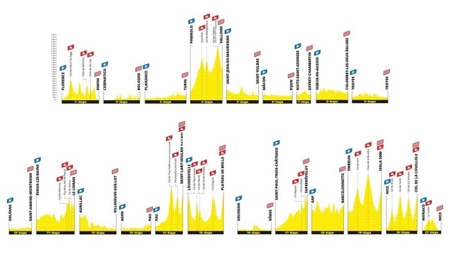 Al igual que viene sucediendo desde 1999, la prueba consta de 21 etapas, con 2 días de descanso intercalados, pudiendo clasificarse esta vez en 6 jornadas llanas, ya que si bien oficialmente hay 9 varias de ellas son en realidad «rompepiernas»; 3 quebradas, que sin ser planas tampoco tienen puertos de entidad, como la etapa del «sterrato»; 5 de media montaña, entre ellas el inicio en Italia, Macizo Central y dos alpinas; 5 de alta montaña, repartidas entre Alpes y Pirineos, todas con final en alto duro, salvo Valloire; y 2 contrarrelojes, ambas individuales, la última cerrando la prueba. En total, 3.498 km sin contar neutralizaciones.