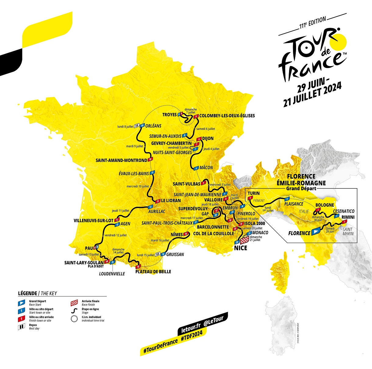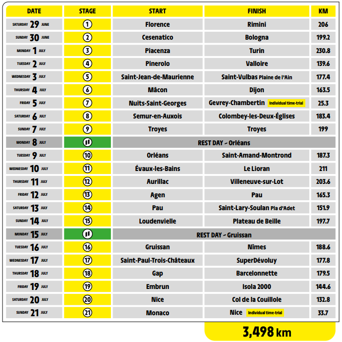 Como decíamos en el artículo previo, se trata de la 111ª edición del Tour, comenzando de nuevo fuera de Francia, en este caso en Florencia, en Italia, al sábado 29 de junio y terminando en Niza, junto al mar Mediterráneo, el domingo 21 de julio, siendo la 1ª vez que el Tour no acaba en París, algo debido a la celebración de los Juegos Olímpicos en la capital gala, oficialmente del 26 de julio al 11 de agosto, aunque ya habrá pruebas ya desde el día 23.