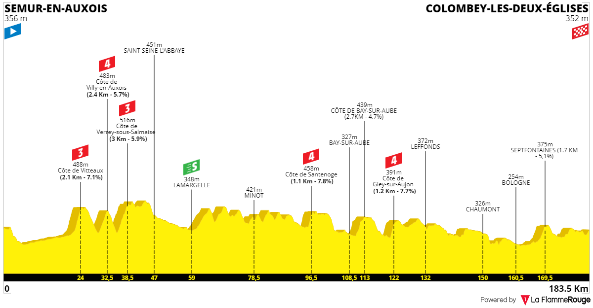 El fin de semana hay dos etapas «rompepiernas«, empezando por una jornada de 183 km entre Semux en Auxois y Colombey les Deux Eglises (8ª), con una ruta más dura de lo que parenta el perfil oficial, estando plagada de pequeñas cotas y repechos, 5 de ellos marcados de 3ª y 4ª categoría, si bien los más duros están muy lejos de meta, con la última cota, no puntuada, a 14 km de una llegada que pica hacia arriba, en un día que da opciones tanto a una escapada como a los velocistas completos.