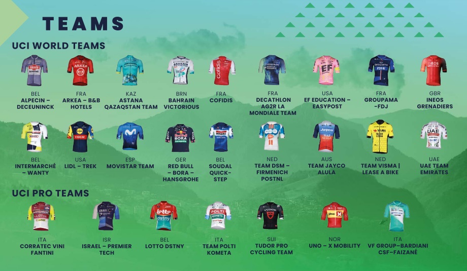 Como es habitual en esta prueba, la participación es de gran nivel, si bien ha habido bajas importantes de última hora, como las de Primoz Roglic, podio en varias ediciones; Tom Pidcock, reciente 2º en Emilia y al que extrañamente su equipo ha dejado fuera; y Mathieu van der Poel, que tenía una buena oportunidad de brillar en esta prueba. En total, serán de la partido 25 equipos, los 18 World Teams y 7 Pro Teams, completando un pelotón de 175 corredores.