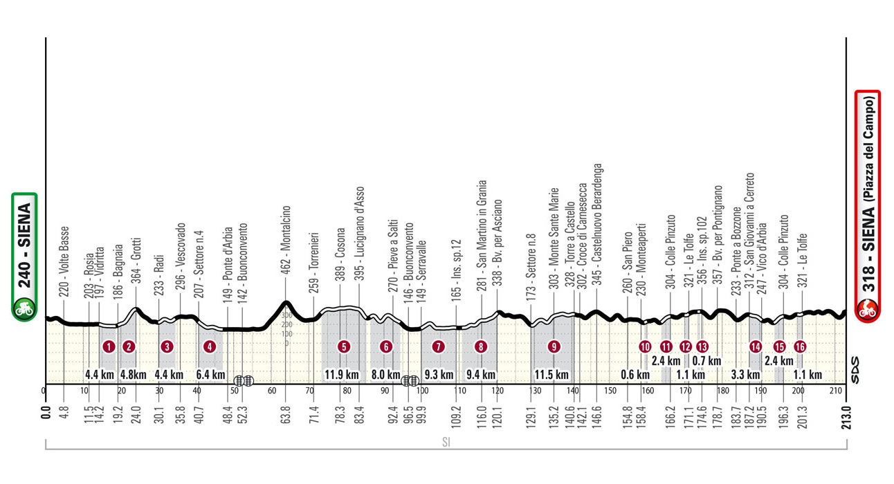 Así pues, tras un inicio llano en dirección suroeste, pronto llega el 1er sector de sterrato, el mencionado Vidritta, afrontando muy seguido Bagnaia, con una dura subida sobre tierra, Grotti, que incluye rampas del 10%. Una vez coronado, descenso sobre asfalto en busca del sector de Radi, que algunos años era la 1ª zona de sterrato, llegando a continuación La Piana (Murlo), un tramo largo, con 6,4 km, pero de tendencia favorable, regresando al asfalto en las cercanías de Buonconvento y la cota de Montalcino, con 6 km al 5% de media. Esta localidad saltó a la fama con la gran etapa del Giro 2010 -> vídeo, ganando Evans, si bien hay que aclarar que se llegaba a Montalcino por otra vía, afrontando la dura subida al Poggio Civitella, con muchos km sin asfaltar y largas zonas por encima del 10%, un tramo que repitió en el Giro 2021, aunque más lejos de meta.