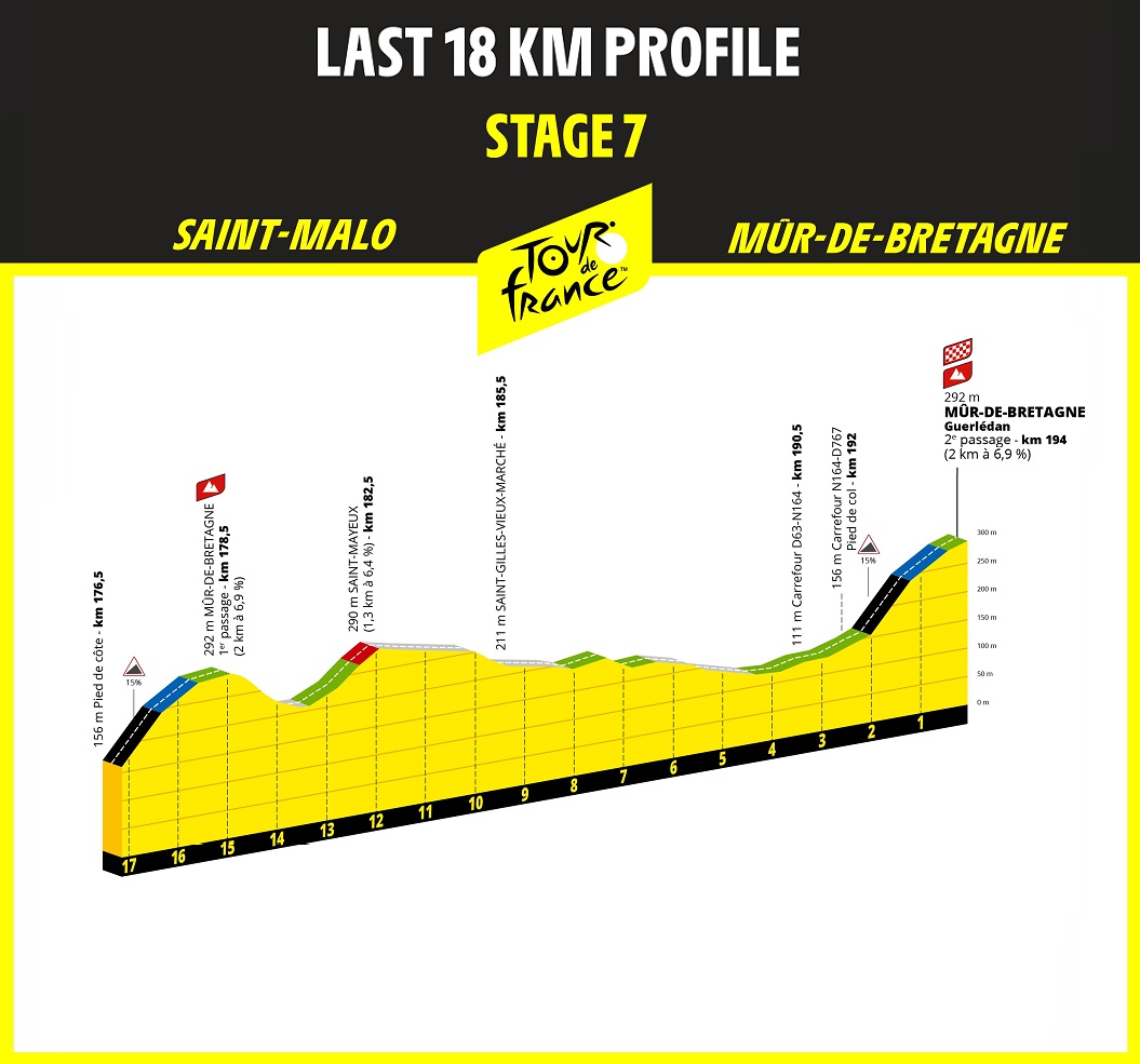 Las 2 etapas siguientes son quebradas con meta en repecho duro, ambas rondando los 200 km: Vire Normandie (6ª), que incluye 6 subidas puntuables -> últimos 13 km, antes del muro final; y Mur de Bretagne (7ª), con doble paso por esta subida -> circuito final, al igual que en 2021, cuando ganó Van der Poel. Extrañamente, el fin de semana hay dos etapas llanas, Laval (8ª), aunque la llegada pica hacia arriba; y Chateroux (9ª), donde a priori solo el viento podría evitar un sprint masivo, quedando para el lunes la jornada de media montaña en el Macizo Central: Le Mont Dore / Puy de Sancy (10ª), incluyendo nada menos que 8 subidas puntuables (además de 4 cotas sin marcar), entre ellas el encadenado final de Croix St. Robert (ojo a la bajada) y Mont Doré / Sancy (últimos 3 km). En total, casi 4500 m de desnivel acumulado.
