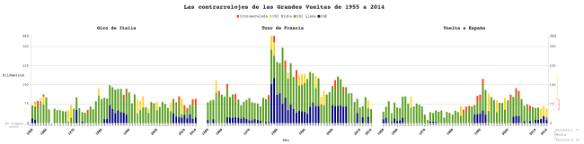 Otra característica desde 1934, cuando estrenaron las cronos en el Tour, ha sido la gran cantidad de contrarreloj, con multitud de ediciones que entre CRI y cronos por equipos sumaban más de 100 km, no bajando de 170 entre finales de los años 70 y mediados de los 90, lo que unido a la dureza de la montaña hacía que para luchar por la victoria los ciclistas tuvieran que ser muy completos, subiendo bien y a la vez siendo grandes rodadores (o muy superiores en algún terreno), con el equipo como otro factor clave si había CRE. Sin embargo, a partir de 2008 y con la única excepción del año 2012, cuando volvió a haber un prólogo y 2 cronos individuales largas, ha habido un claro descenso en el nº y longitud de las cronos, llegando a los extremos de 2015, cuando se batieron todos los records negativos de CRI, con apenas 14 km, y 2017, con el total más bajo de contrarreloj: 36,5 km (hasta el año pasado …), una tendencia que se ha mantenido las últimas ediciones, con solo 37 km en 2020 y apenas 22 km en 2023, aunque también ha habido años cercanos a los 60 km,