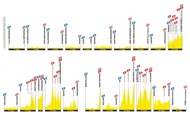 Analizando las etapas por separado, hay cosas muy interesantes, como la dureza de varias de las jornadas de montaña, con 4 de ellas superan los 4400 m de desnivel, e incluyendo la recuperación de Superbagneres 35 años después, así como el «picante» que aportan las etapas quebradas durante toda la prueba. Pero si se mira el recorrido global, no solo está muy desequilibrado, con únicamente 33 km de crono llana, sino que el abuso de finales duros (5 en HC) hace que el diseño de la alta montaña sea muy repetitivo: ni una sola etapa con final tras descenso o llegada más suave. Y aunque pueden dar juego, las etapas tipo clásica de la 1ª semana también son repetitivas entre sí: muritos + final en repecho, siempre sobre asfalto, sin pavé o tierra. Y no sustituyen a etapas llanas, habiendo 4 en los primeros 9 días, sino a jornadas con puertos más largos