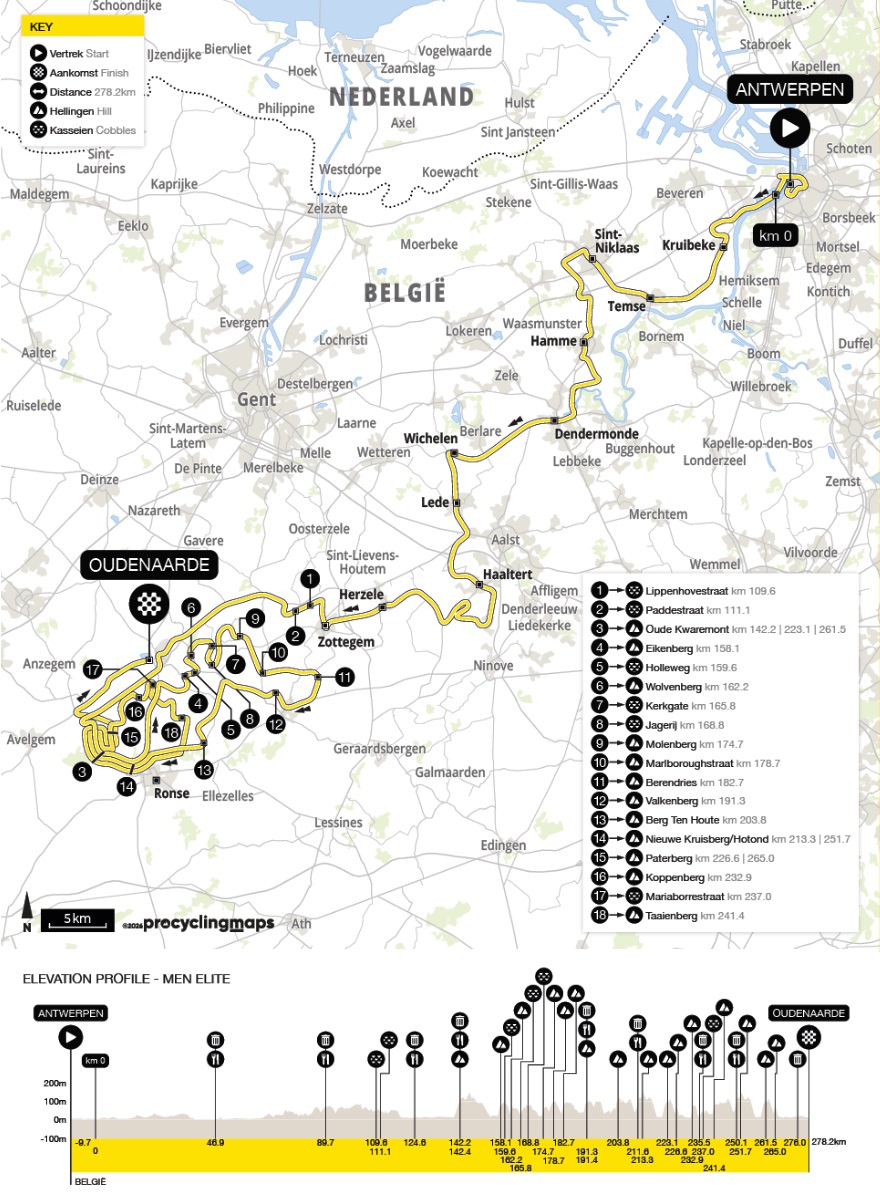 Como decíamos al inicio, el trazado de este año es una mezcla de las 2 últimas ediciones, recuperando la salida de 2024, al comenzar en Amberes en lugar de Brujas, que se están alternando como inicio las últimas ediciones, y 2025, repitiendo de hecho los 95 km finales, incluída la meta en Oudenaarde, si bien con una distancia total superior: 278 km (sin contar la neutralizada), la más elevada desde 1988, incluyendo 16 cotas oficiales, 11 de ellas adoquinadas, y 6 tramos de pavé llanos.