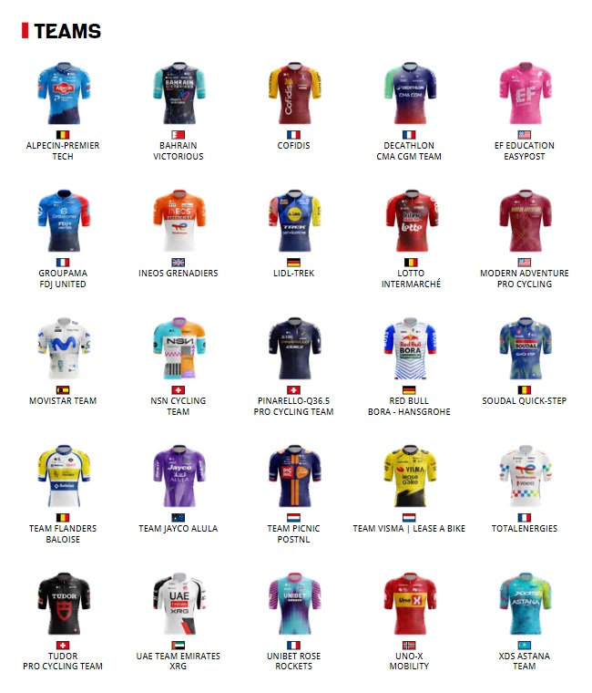 La lista de participantes de esta edición es a priori espectacular, ya que no solo están presentes casi todos los grandes «pedruscómanos», destacando el vencedor de las 3 últimas ediciones, Van der Poel, sino que ha vuelto a unirse a la fiesta Tadej Pogacar, 2º en su estreno el año pasado. En total, serán de la partida 25 equipos, los 18 World Team y 7 Pro Team, completando un pelotón de 175 corredores.