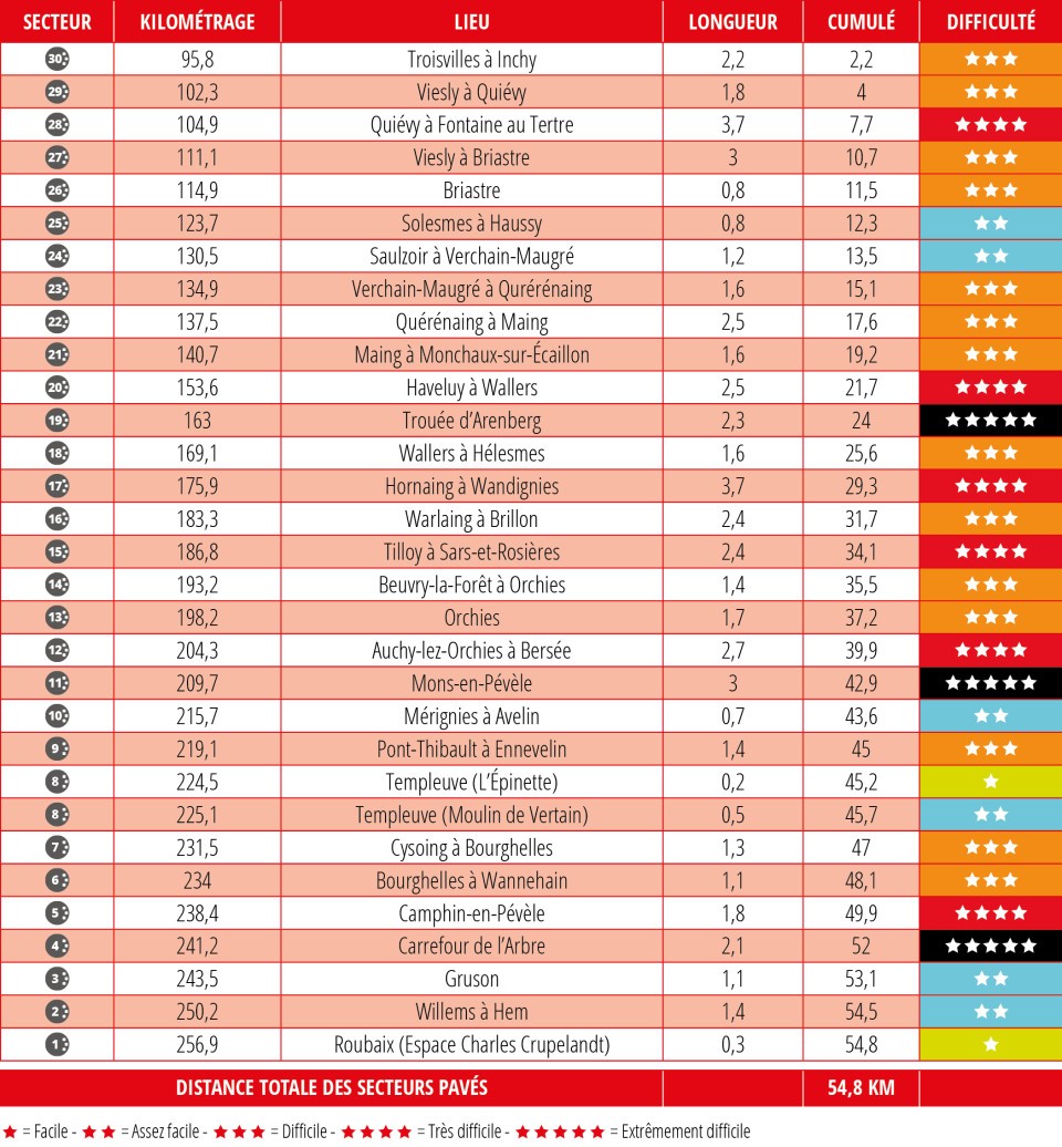 Los otros 2 sectores de máxima dificultad que se atraviesan actualmente son Mons-en-Pèvèle, estrenado en 1978, con 3 km de longitud y 2 curvas de 90º; y el Carrefour de l’Arbre, incluído por 1ª vez en 1980 y situado ya más cerca de meta que los anteriores, siendo la última zona de adoquines realmente complicada de la prueba. Por otro lado, también es icónica la llegada en el velódromo de Roubaix, final desde 1943 (salvo un pequeño intervalo por obras de 1986 a 1988) y al que los corredores tienen que dar una vuelta y media antes de acabar la prueba.