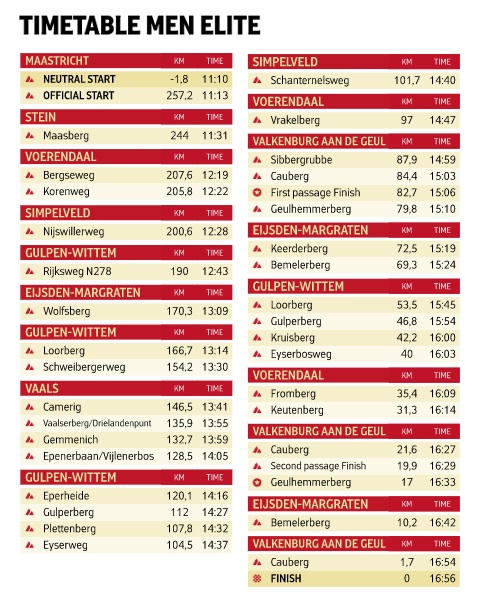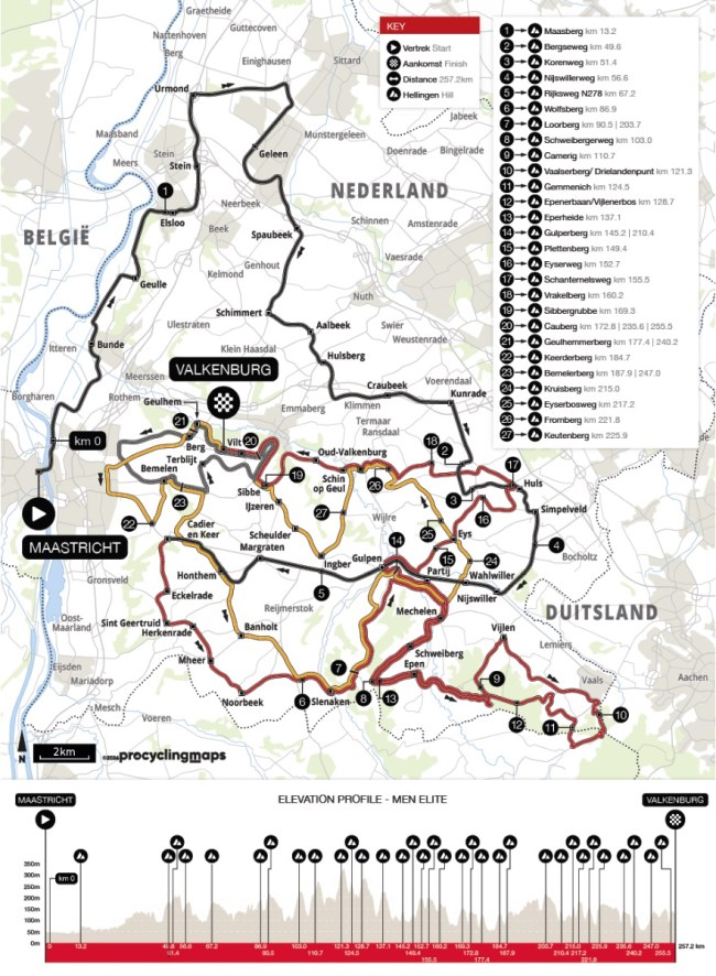 Como decíamos al inicio, el recorrido de este año es casi idéntico al del año pasado, cuando se recuperó el Cauberg como última subida, algo clásico desde 2003 a 2016, incluso acabando en su cima hasta 2012, pero que no se veía desde entonces. De hecho, se repite la salida desde Maastricht; la llegada en Vilt–Berg en Terbligt; prácticamente todas las cotas, con el único cambio de la supresión de Adsteeg al inicio; y los 3 bucles distintos en torno a Valkenburg, circulando por vías muy secundarias entre Geulhemerberg y Bemelen, para un total de 257 km, sin contar la neutralizada.